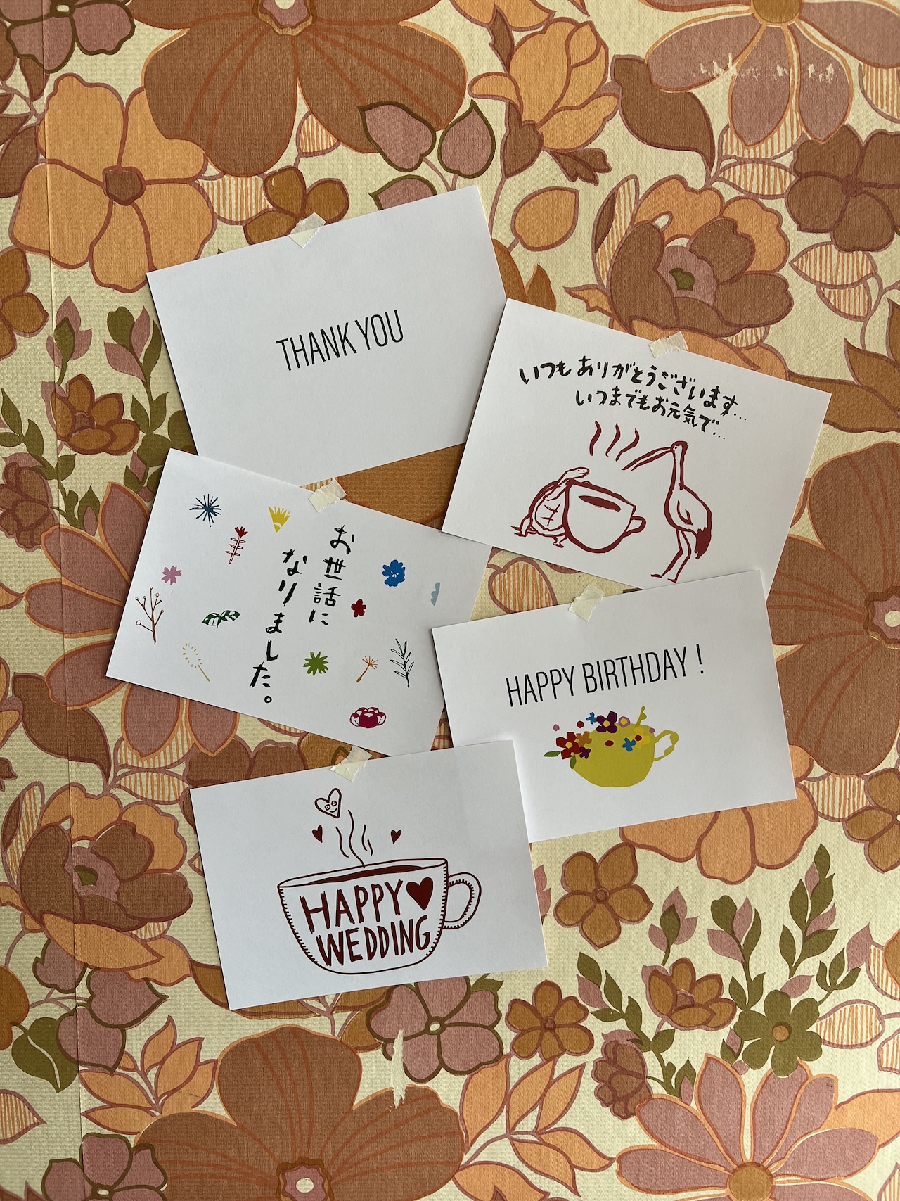 「THANK YOU」「HAPPYBIRTHDAY」「お世話になりました」「HAPPY WEDDING」「いつまでもお元気で」の5種類です。